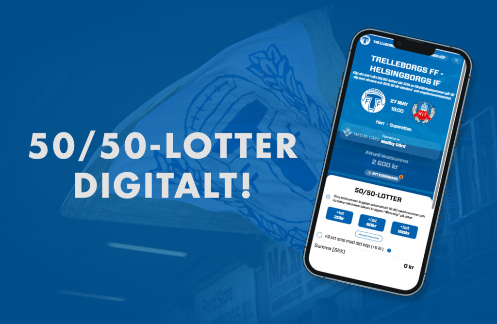 Vi kan nu också erbjuda digital försäljning av 50/50-lotter även till dig utanför Trelleborgs kommun. Den lyckliga vinnaren blir meddelad att den vunnit direkt efter att vinstnumret presenterats av speakern och efter det får vinnaren vinsten utbetald via swish. Det betyder att även du som inte har möjlighet att vara på plats under matchen kan delta i lotteriet. Genom att köpa 50/50-lotter under våra matcher så stöttar du vår akademi- och ungdomsverksamhet. Köp lotter på trelleborgsff.se/5050.